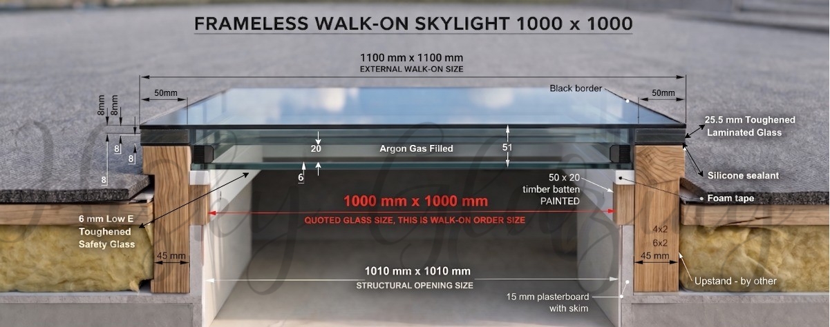 Example: A 1000mm x 1000mm skylight requires a 1010mm x 1010mm opening.Top Glass Overhang: The top pane extends 50mm beyond the quoted size on all sides.