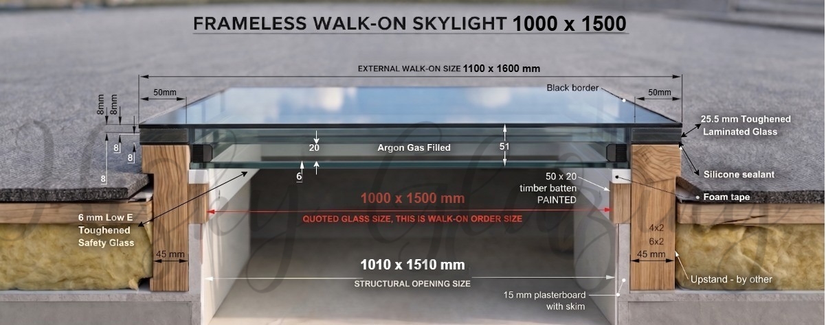 All roof lights are made to order; sizes cannot be altered after glass cutting or toughening.