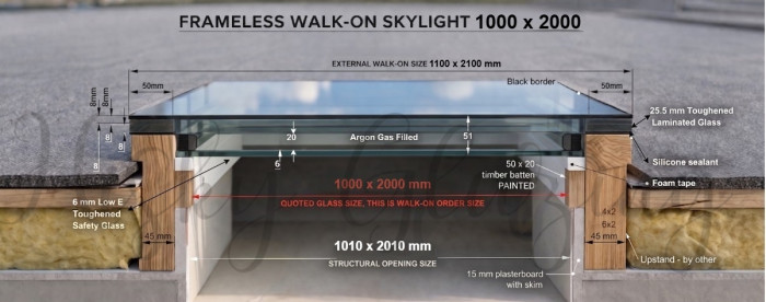 Example: A 1000mm x 1000mm skylight requires a 1010mm x 1010mm opening.Top Glass Overhang: The top pane extends 50mm beyond the quoted size on all sides.