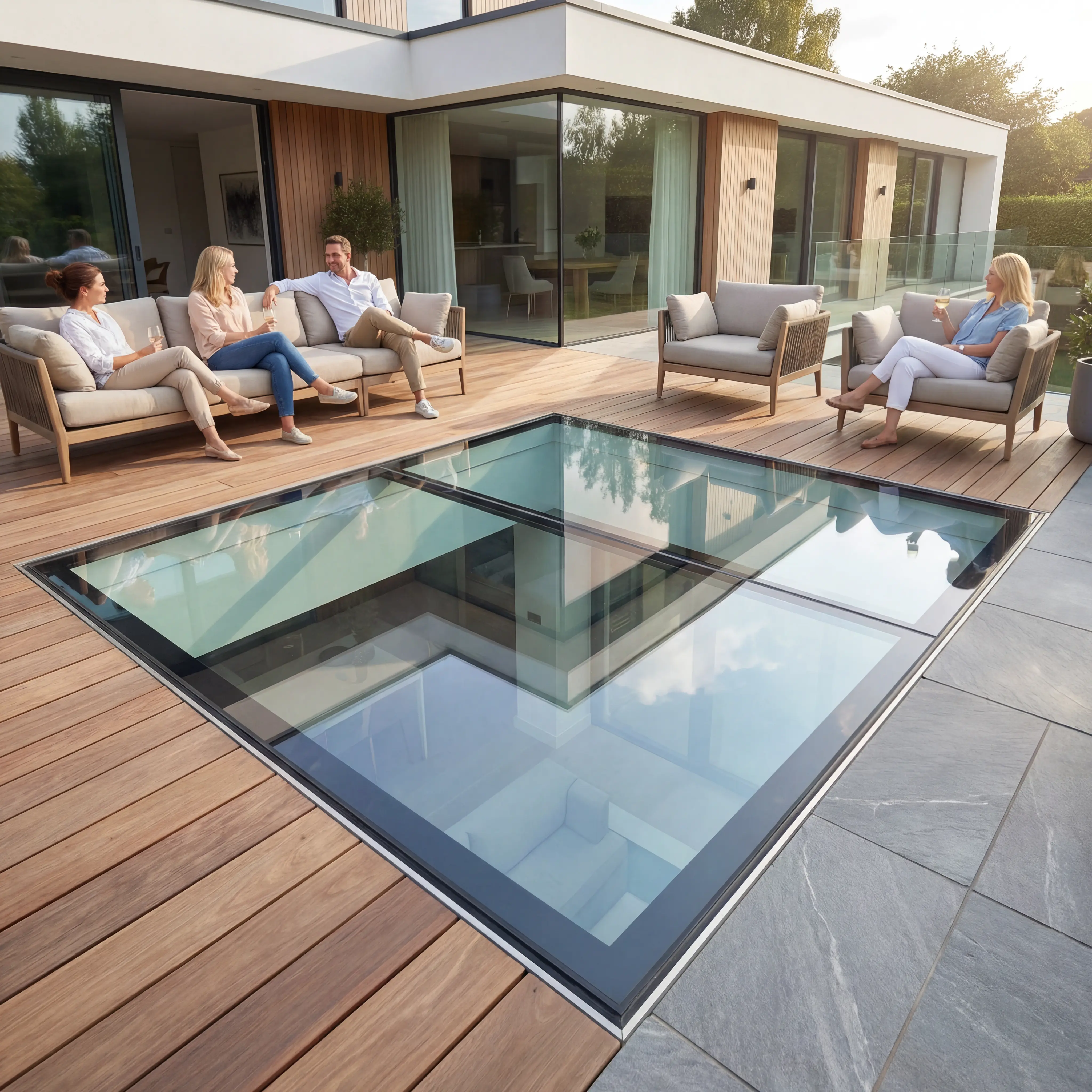 Our Walk-on units boast three layers of 8mm Toughened Glass, all laminated together, to achieve a lighter, yet strong walk-on surface. The thickness of the top glass of our units is 25.5 mm and is finished with a component laminate, making them one of the safest and most thermally efficient products you can buy.